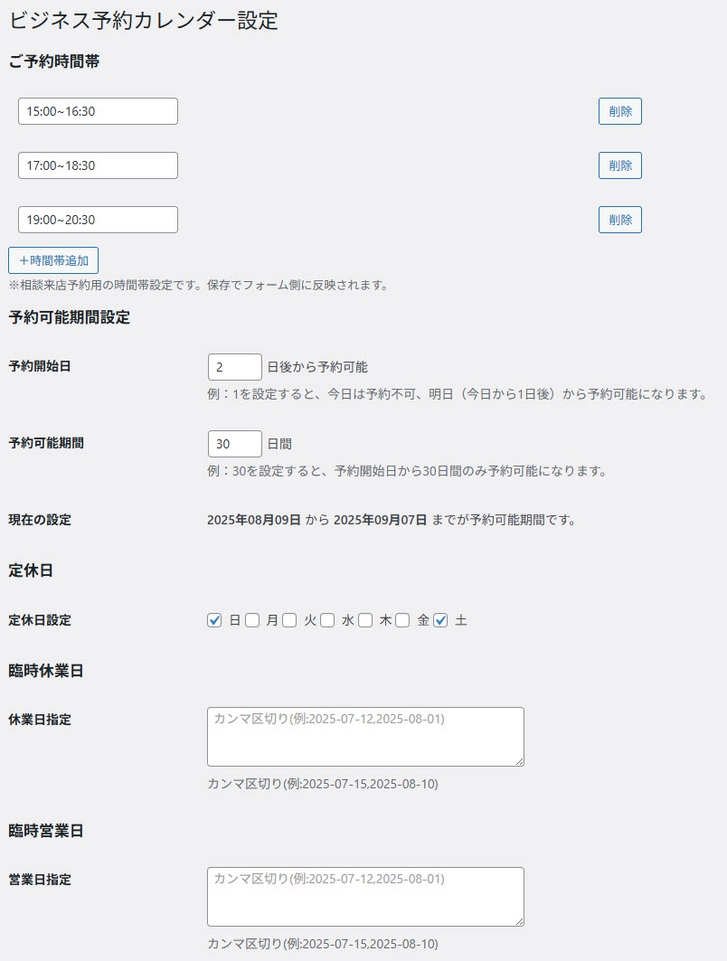 こんな感じの設定画面で定休日や予約時間帯などをカスタマイズできます。