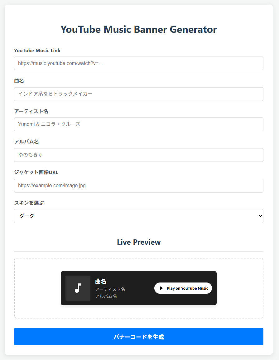 こんな感じで、Youtube musicのリンクを入れれば、音楽再生リンクバナーを作れます。